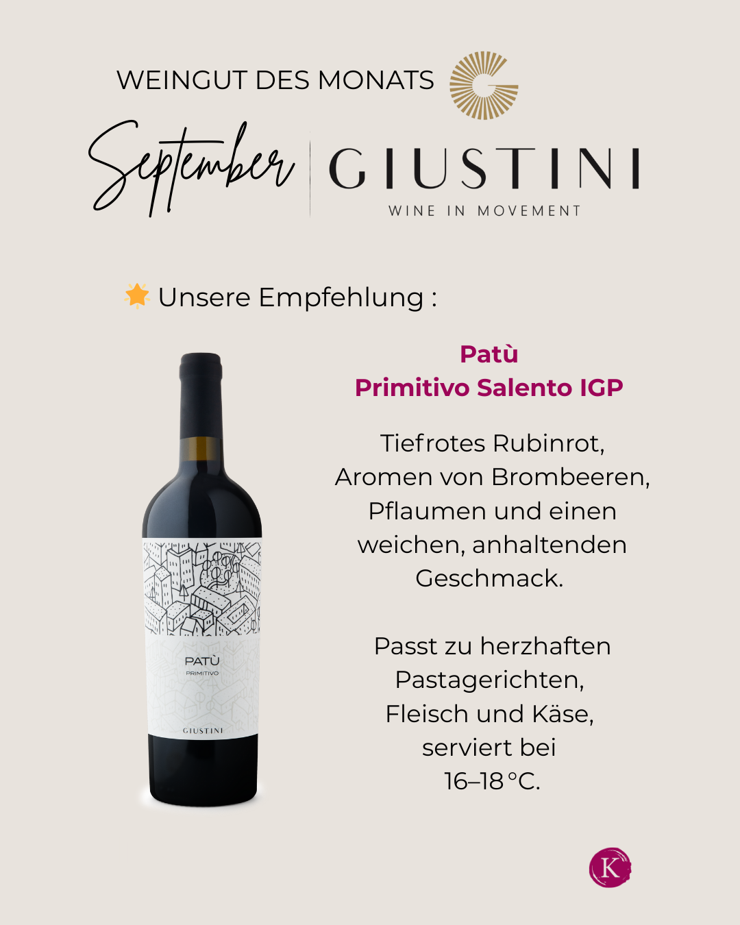 Der Patù Primitivo Salento IGP 2023 präsentiert sich in tiefem Rubinrot mit purpurnen Reflexen. In der Nase entfalten sich Aromen von Brombeeren, Pflaumen und Waldbeeren, begleitet von balsamischen und mineralischen Nuancen. Am Gaumen zeigt er sich vollmundig, weich und ausgewogen, mit süßen Tanninen und einem anhaltenden Abgang. Die Trauben werden im Cordone speronato-System erzogen und in der letzten Septemberdekade gelesen. Nach der schonenden Pressung erfolgt die Gärung bei kontrollierter Temperatur, gefolgt von einem mindestens sechsmonatigen Ausbau im Edelstahltank, um die Frische und Fruchtigkeit zu bewahren. Dieser Rotwein passt hervorragend zu würzigen ersten Gängen, Pasta al Pomodoro, Pizza und Braten. Serviertemperatur: 16–18?°C. Trinkreife: ca. 5 Jahre.